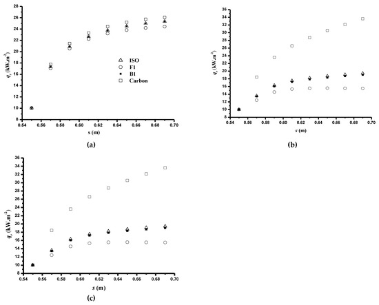 Distributions of the net radiation heat flux density profils on the walls of the left pyrolysis room (z = 0.6 m, κ = 1 m−1): (a) ω = 0.1, (b) ω = 0.5, (c) ω = 0.9.