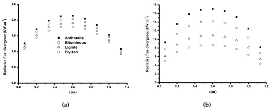 Figure 11a,b illustrates the predictions of the radiation flux divergence along the centerline (0.9, 0.6, z) m for different particle materials (), an albedo coefficient and two absorption coefficient values. It can be noted in Figure 11a that all the curves have the same shape and they are high in the center region. The radiation source term profiles follow the same trend as in [19]. Moreover, the difference between the highest value (for anthracite) and the lowest value (for fly ash) varies between 15.07% and 16.82% for m−1 and around 49% for the relatively optically thick medium ( m−1). Further radiation energy is transferred through the medium whereas the optical thickness is enhanced. The highest amount of the radiation flux divergence corresponds to the anthracite which is multiplied by a factor of 8, when increasing the absorption coefficient from to m−1. This is might be due to the large value of the imaginary part of anthracite’s complex index of refraction.