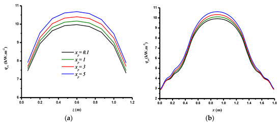 Figure 12a,b demonstrates the predictions of the radiation heat flux for fly ash in y-direction, having various particle size parameters: (a) qyz at the middle of the south hot surface along (0.9, 0.0, z) m and (b) qyx at the middle of the north surface along (x, 1.2, 0.6) m with a purely scattering medium (ω = 1). The profiles of the involved phase functions are presented in Figure 2. One can easily notice that when the particle size parameter increases, the forward scattering behavior becomes more significant. According to Figure 12a, the largest radiation heat flux density, produced by the highest value of the particle size parameter. The radiation heat flux difference between the smallest and the largest particle size parameter is equal to 6.64%. While, in Figure 12b this difference is the largest at the location x = 0.9 m, (i.e., 6.67%). Approaching the ends, where the side baffles are located, the difference becomes more and more weak. The mean temperature calculated at the plane z = 0 varies between 585.56 K and 588.99 K, and the mean radiation heat flux varies between 6.64 kW·m−2 and 6.81 kW·m−2. It is concluded that by increasing the size parameter, the evolution of the temperature and net radiation heat flux density transfer is imperceptible.