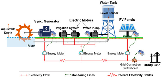 This paper proposes a model of an energy management system that involves the use of RERs and a river turbine. The main purpose of the system is to supply electricity from local energy resources, minimizing the need to purchase electricity from the utility grid, leading to reduced electricity costs. Figure 1 gives an overview of the proposed system model. There are two renewable energy resources in this system to ensure agricultural sustainability: PV panels and a river turbine connected to a synchronous generator. Thus, the model is intended for scenarios where the farm is located next to a river on which a turbine is placed to rotate the shaft of the synchronous generator. Furthermore, there are three electric motors, two of them responsible for irrigation system and the other one responsible for pumping the water from the river to a water tank. Furthermore, there is a level sensor inside of the water tank indicating the amount of water stored in it. Thanks to this sensor, the water pump motor can be controlled accordingly.