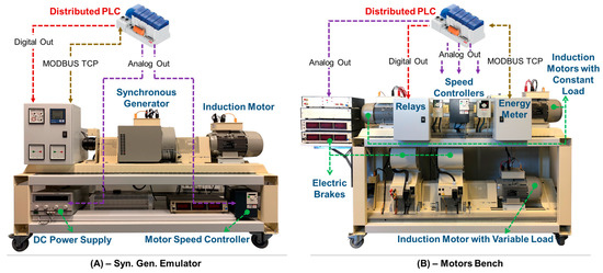 The second emulator utilized in this model is motor bench, as illustrated in Figure 2B). In this emulator, there are two 1.5-kW three-phase induction motors with a constant load and one 3-kW three-phase induction motor with variable load. The motors with constant load always have a constant rate of electricity consumption since a load is already fixed and applied to the shaft of each motor. However, in a 3-kW motor there is an electric brake system applied to the shaft of the motor that enables the system to have a variable rate of loads on its shaft, so the electricity consumed by the motor would vary. The distributed PLC installed in this emulator controls the speed of each motor separately, as well as the electric brake ranging from 0% to 100%, using analog output channels.