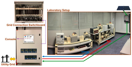The PV system, as well as the two emulators shown in this section, are all connected together through an internal electricity network as shown in Figure 4. This internal electricity network consists of three power lines, one for each resource of the system. The grid connection switchboard shown in Figure 4 is the connection point of the power lines to the utility grid. In addition, there is a console implemented in the switchboard showing a web-based graphical interface for monitoring the system parameters, such as electricity market tariffs, the status of each emulator, and real-time consumption and generation.