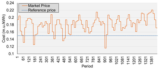 The profile shown in Figure 5 was created on the basis of the records given in the Portuguese section of the Iberian Electricity Market (www.omie.es). In the proposed agricultural energy management system, the electricity grid is considered as an external supplier, which supports the system whenever the local energy resources cannot supply the electricity demand. In this case study, it is considered that the user can also define reference price (as shown in Figure 5), so that when the electricity market prices are cheaper than the maintenance and technical costs of the local energy resources, the system is allowed to use electricity from the grid instead of using local resources (e.g., synchronous generator).