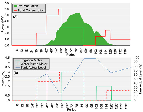 In addition, Figure 6A shows the total consumption and generation profiles considered in the system, and Figure 6B illustrates the detailed consumption profiles of the irrigation motors as well as the water pump motor. Furthermore, the level of water stored in the tank ranged from 0 to 100%, as shown in Figure 6B. In this case study, the initial tank level was considered to be 50%. The PV production profile shown in Figure 6A is a real profile adapted from the GECAD research center database.