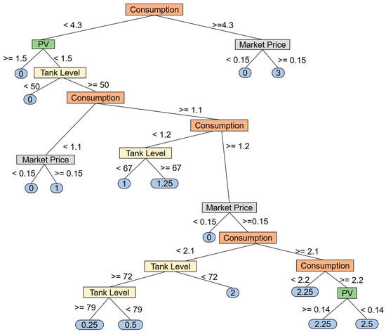 The accuracy of the results of a DT is dependent on a series of factors, such as the nature of the input data, the vastness of the dataset, the calculation methods, etc. In fact, whenever the number of splits in a DT increases, the DT becomes more complex and precise. Figure 7 illustrates the created DT using the dataset shown in Table 2. The consumption and the PV values represented on the DT are in kW, market prices are in EUR/kWh, and the tank level ranges between 0 and 100%.