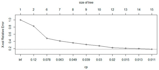 Table 4 shows the pruning from the “RPART” algorithm for the developed DT. In this table, each row specifies the depth of the tree and the calculations that correspond to that level. In fact, the number of splits in each level is increased until the algorithm reaches an optimal level with a low error rate. Moreover, in Table 4, the relative error indicates the prediction error of the data that was used to make the tree, and the cross-validation error is the amount of error produced by the “RPART” built-in cross-validation. In addition, CP stands for complexity parameter, which is a value in each depth of the tree used to perform divisions in the nodes until the relative error decreases to a desired rate. In other words, CP controls the size of the tree and chooses the optimal tree size. Moreover, CP determines how the cost of a tree is affected by the number of terminal nodes , which results in a standardized cost [36]. In Equation (9), a larger amount of results in small trees and potential underfitting, and small results in larger trees and potential overfitting. The process of CP calculation is clearly illustrated in Figure 9.