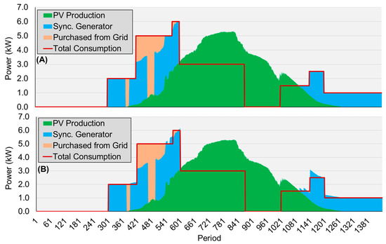 By comparing Figure 10A,B, it can be concluded that the developed DT results are very similar to the scheduling results of the optimization algorithm. This can prove the performance of the DT and its decision rules since the system can operate in an optimal way using the developed DT. In both scheduling results shown in Figure 10, PV production is the first source of energy for the supply of the demand, and then the system regulates the output of the synchronous generator to supply the remaining energy needs. In periods of high consumption, the energy supplied by the PV and the synchronous generator is not enough and the system purchases energy from the electricity grid. However, there are several periods in which the PV generation is higher than the consumption rate, so the system injects the surplus energy into the electricity grid. It should be noted that the DT is only applied in the system when the consumption and generation rates are higher than zero since there is no need to apply the scheduling when these two rates are equal to zero.
