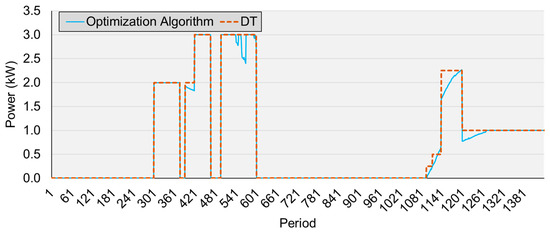 In this section, the energy scheduling results of the optimization algorithm as well as the developed DT are outlined and compared. The mathematical formulations shown in Section 2.2 were used to present the optimization problem, which was then solved by means of linear programming with the “OMPR” package of RStudio®. The energy scheduling results using the optimization algorithm are shown in Figure 10A. Furthermore, the DT and its decision rules shown in Section 5.1 were also implemented in RStudio®, and the energy scheduling results using DT were acquired, as illustrated in Figure 10B.