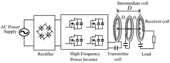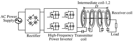 Figure 1 shows an MCR-WPT system with an intermediate coil, which is the coaxial circular coil. The transmitter circuit is composed of an adjustable rectifier whose input is city alternating current power, a high frequency power inverter, transmitter coil, and the compensation capacitor. Similarly, each intermediate resonator circuit is composed of an intermediate coil and a compensation capacitor. The receiver circuit is composed of the receiver coil, the receiver compensation capacitor, and a load.