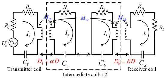 The distance between the transmitter coil and the intermediate coil-1 is expressed as ; the distance between the intermediate coil-1 and the intermediate coil-2 as , and the distance between the intermediate coil-2 and the receiver coil as , where , , and , are defined as the distance coefficients. On this topology, the distance coefficient should satisfy the following relations: