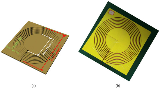 In a MCR-WPT system, the coil of a planar spiral type is often used, owing to the magnetic field generated by the planar spiral coil is relatively uniform. In this paper, the coil’s structure is planar, circular, and spiral, where the inner diameter is 140 mm, the outer diameter is 300 mm, the spacing interval between each ring is 7.5 mm, and the number of coil turns is 8, while the diameter of the conductor copper wire is 2.5 mm. The rendering-graph and photograph of the coil is shown in Figure 7. The inductance of this coil is 17.322 H calculated according to [25]. When the compensated capacitance is 0.22 nF, the resonant frequency, which is provided with the inductance and capacitance mentioned above, is 81.3 KHz.