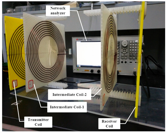 Experimental prototype of the MCR-WPT system with two intermediate coils.