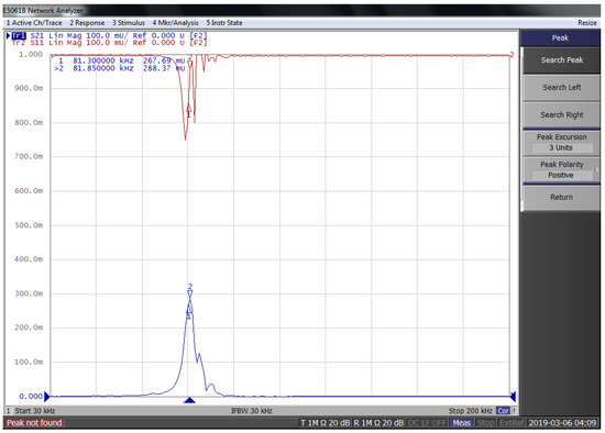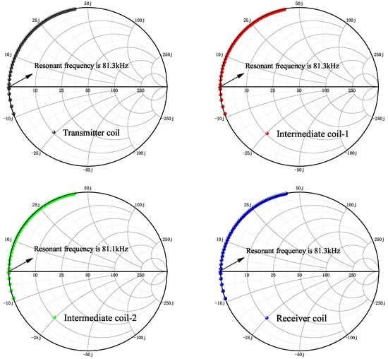 In addition to accurately measuring the coil inductance and capacitance values used in the experimental platform, the frequency characteristics of the four coil resonant circuits used in the experiment are analyzed through the frequency sweeping function of the network analyzer. In addition, the Smith chart for each circuit is then shown in Figure 9. The transmitter coil, intermediate coil-1, intermediate coil-2 and receiver coil resonant circuits are scanned in the range of 50 KHz–400 KHz (because the resonance frequency is estimated to be 81.3 KHz). Each coil and compensation capacitance are connected to the network analyzer probe in series to adjust those resonances, and then, at the resonant frequency, the impedance of the resonant circuit should be close to 0. Based on the experimental results, 81.3 KHz is determined as the resonant frequency of the system.