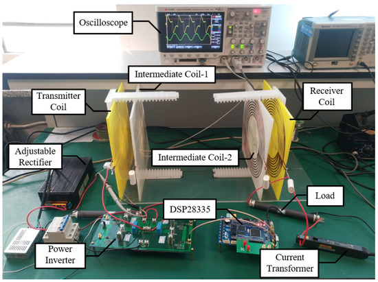 In addition to measuring the parameters with the network analyzer, the high power platform as shown in Figure 11 is used to verify the correctness of the optimal assign method for coil distances in the three-coil and four-coil prototype. In the adjustable rectifier, 220V-50 Hz AC (Alternating Current) is converted to DC(Direct Current) 24-50 V. In the power inverter, the high frequency power that has same frequency as resonance is inverted from DC 24-50 V, and then provided to the MCR-WPT system. The high frequency power is transmitted from the transmitting coil to the receiving coil, through intermediate coil-1 and intermediate coil-2. In the experimental prototype system, the power frequency is 81.3 KHz.