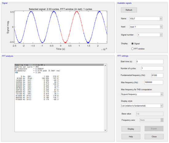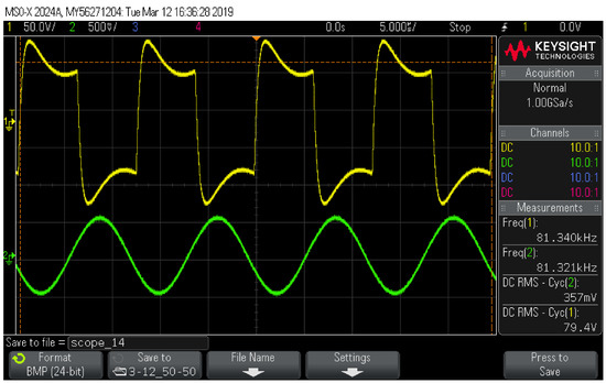 In addition, a group of experimental results is shown in Figure 13. The yellow curve is the voltage across the output terminal of power inverter, the green curve is the current flowing through the load connected in series with the receiving coil, and the FFT analysis is performed for the current waveform of the load as shown in Figure 14. From the FFT analysis, it is found that the constituents of (third-harmonic wave) and (fifth-harmonic wave) are small, which means that the power quality of the load is very high. This implies that the transmitter resonance circuit, two intermediate resonance circuits, and the receiver resonance circuit are with multiple filtering effects. The experimental results are shown in Table 4.