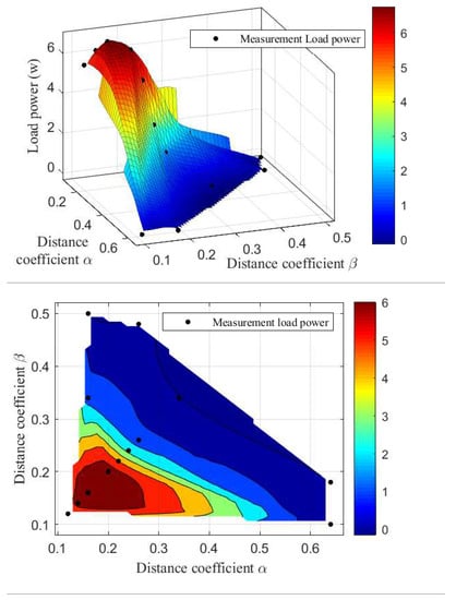 According to Table 4, the relationship between the load power and the distance coefficients and is as shown in Figure 15, and the overall trend is similar to the simulation results as shown in Figure 6. The deviation at the maximum power point is 5.14%, and this part of the power loss is mainly consumed on the MOSFET(Metal-Oxide-Semiconductor Field-Effect Transistor) and the internal resistance of intermediate coils. The experimental results are basically consistent with the previous analysis and design.