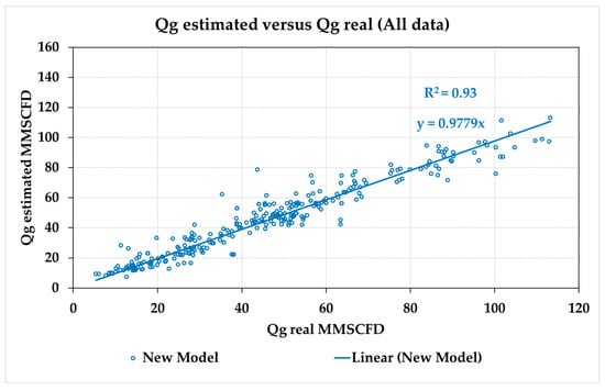 The estimated gas flow rate using the tuned Gilbert-type formula, Equation (13) versus real gas flow rate, is shown in Figure 1. It can be noted in Figure 1 that the new model predicted the gas flow rate through wellhead choke was in an excellent agreement with the real gas flow rate, i.e., R2 = 0.93. As is shown in Figure 1, the unit for gas flowrate was MMSCFD. MMSCFD stands for million standard cubic feet per day. Million standard cubic feet per day is a unit of measurement for natural gases in the world. It is frequently abbreviated MMSCFD.