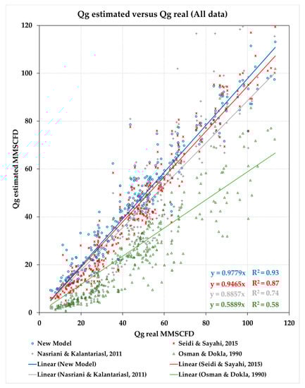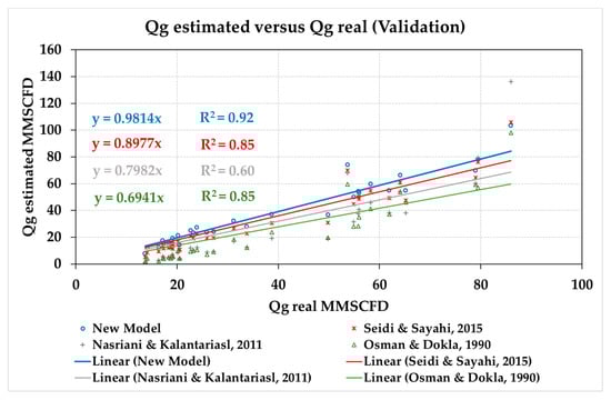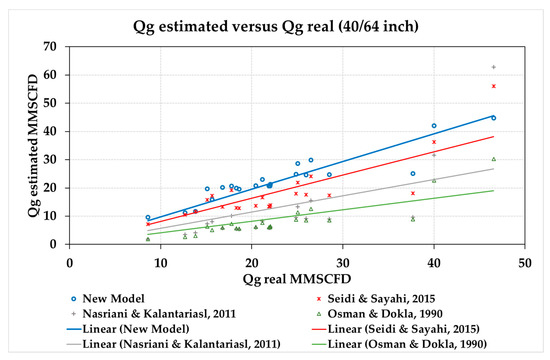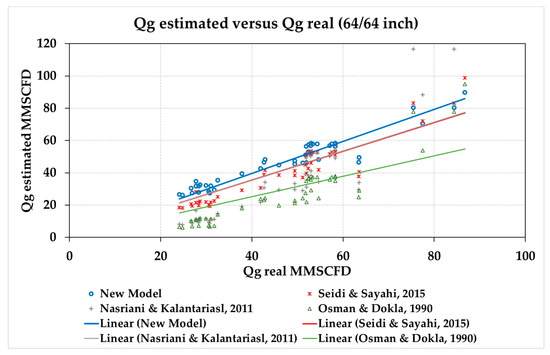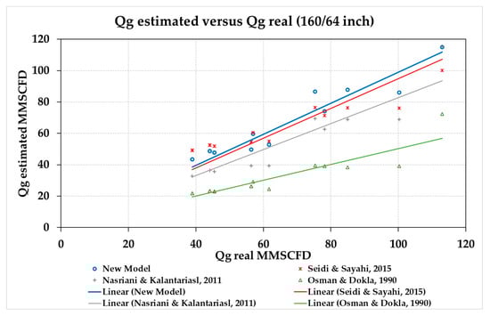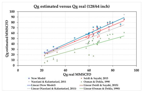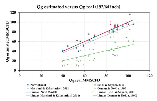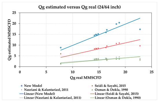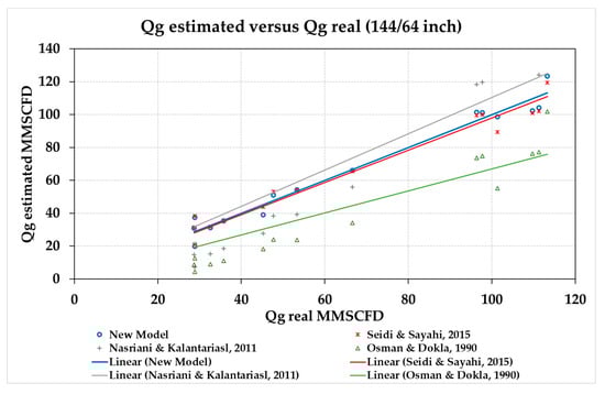 The comparisons of six different measures of accuracy corresponding to different models using the production data set of the choke sizes from 24/64 to 192/64 are shown in Table 6, Table 7, Table 8, Table 9, Table 10, Table 11 and Table 12. The estimated gas flow rate using the tuned Gilbert-type formulas for individual choke sizes (Equation (14)) as well as the estimated gas flow rate using the other three correlations as mentioned above versus real gas flow rate are shown in Figure 5, Figure 6, Figure 7, Figure 8, Figure 9, Figure 10 and Figure 11. It can be noted from these figures that the new model which predicted the gas flow rate through the wellhead choke was in perfect agreement with the real gas flow rate—the calculated value of R2 for the new model was closer to unity compared to that of the other models. Similarly, for all the other error parameters, the newly established correlation had the smallest possible values of errors.