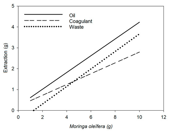 Our study of the integrated use of MO seed included an analysis of the potential of extracted oil and bioflocculating–coagulating activity (Figure 1). The results showed a positive correlation (correlation coefficient (R) = 0.94) between the oil content and the amount of MO (Figure 2) suggesting that for each gram of the M. oleifera seed, approximately 0.5 g oil can be obtained (50%, w/w) (Equation (8)).