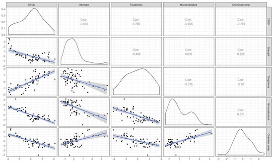 Figure 2 shows the correlation and scatterplot diagrams between all the variables (objective and explanatory) taken two-by-two. The kernel density estimation (KDE) representation is also a way to estimate the probability density function of a random variable. A strong correlation can be observed among the CTOD and the explanatory variables, particularly toughness, microstructure, and chemical composition. Excluding the chemical composition, other variables do not seem to follow a normal distribution.