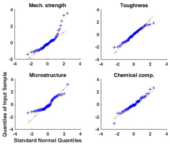 Figure 3 shows the quantiles of input samples (explanatory variables) versus standard normal quantiles (theoretical quantiles from a normal distribution). If the distribution of the explanatory variable is normal, the plot will be close to linear. Except for the chemical composition and toughness, the rest of the independent variables (the mechanical strength, called M. Strength onwards, and microstructure) do not seem to follow a normal distribution, so it would be advisable to make a transformation (for example, logarithmic type) before carrying out a multiple regression analysis. This can be explained by the observation of the KDE of the corresponding variable in Figure 2, where the M. Strength variable shows a positive skewness towards lower values and the microstructure shows a slightly bimodal distribution (this effect is eliminated through a logarithmic transformation after the outlier exclusion).