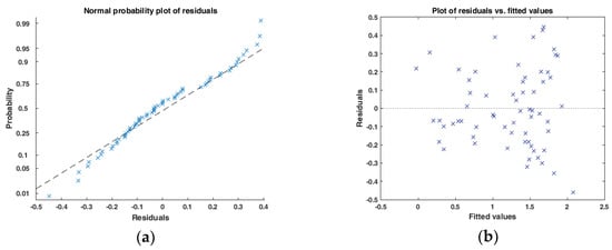 Using Equations (12) and (13), the values of the parameters are calculated. In Table 4, the coefficients for the multiple linear regression (Equation (16)) can be found. It can be seen that all coefficients are significantly different from zero, but toughness is the variable with the highest absolute value. In this case, the number of observations is 63, and the error degrees of freedom is 58.