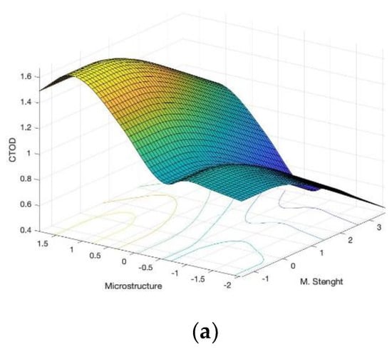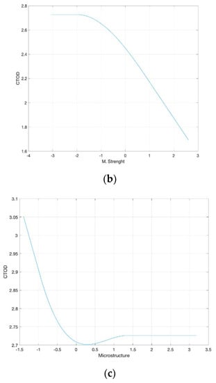A MARS model was applied using cubic splines. This method considers nonlinear relationships among the CTOD variable and the explanatory ones using a spline adjustment, obtaining a and . With a training sample of 50 data sets and test sample of 13, the results were and . Additional information may be found in Figure 5, where the MARS model is plotted for two of the explanatory variables and two anaylsis of variance (ANOVA) functions (this visualizes the contribution of the ANOVA functions for the pairs CTOD-M. Strength and CTOD-microstructure in the MARS model).