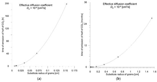 Desorption of sorbate from coal is time-consuming. Figure 1a,b present a demonstration time period in which half of the total CO2 content is emitted from the coal samples with De = 10−9 cm2/s with equivalent radii in the range of 0.007–0.15 cm (Figure 1a) and 0.007–1.5 cm (Figure 1b). Even in the case of small grains, if the most typical values of effective diffusion coefficients are taken into account, this process can last from several hours for grains below 0.01 cm, through several weeks for millimeter grains, to months and years for centimeter and larger samples. The kinetics of CO2 desorptions depend on the second power of the grain equivalent radius.