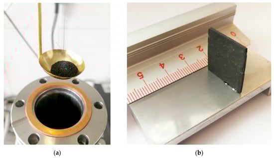 Coal from two coal mines in Poland was selected for testing. The coal material was divided into two groups. Part of the coal was crushed and sieved to separate the grain size of 0.2–0.25 mm (Figure 2a). From the other part samples were prepared on a laboratory polisher whose height and width were much greater than the depth. The minimum achievable thickness of the samples was about 0.6 mm (Figure 2b), with a height and width of about 20 mm. Due to the significant disproportion of height and width dimensions to the depth, the prepared sample was considered a plane sheet.