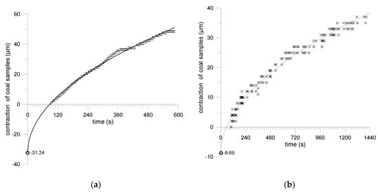 Shrinkage of unloaded coal samples was observed using a laser altimeter. The sample was saturated with CO2 in an external tank and immediately placed under the head of the altimeter. The CO2 desorption process and the accompanying shrinkage were triggered by a step change in the gas pressure from saturation pressure to atmospheric pressure. The recorded changes in the sample size are shown in Figure 15 and Figure 16.
