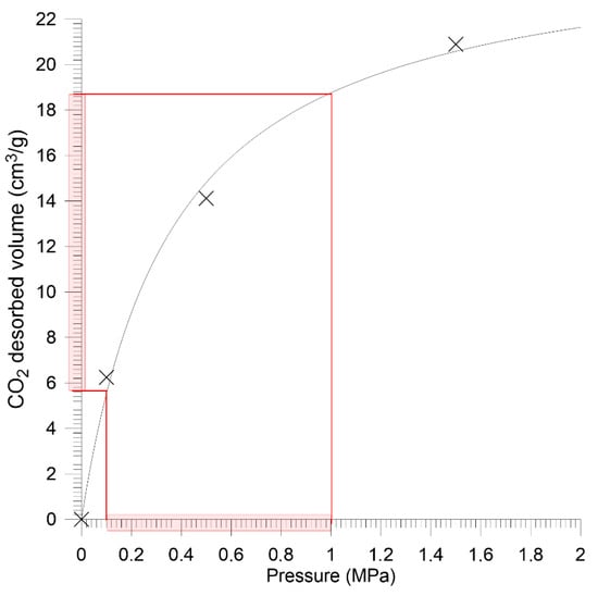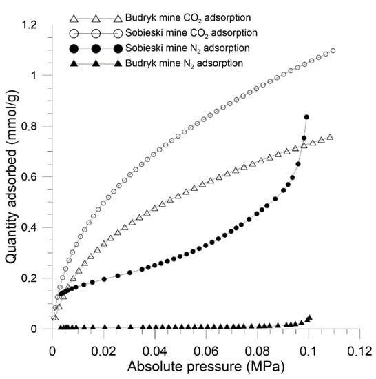 From a geological point of view, coal is a highly heterogeneous rock and a collector for gases naturally occurring in coal seams and fluids. Natural deposits of coal are characterized by a network of fissures and cracks as well as pores of various diameters. Depending on geological factors, including tectonic stress and near-fault areas, the crack network may occur with varying intensity [1,2]. The pores in coal comprise macropores with diameters above 50 nm, mesopores (2–50 nm) and micropores with diameters below 2 nm [3]. In the category of micro-pores, Sing et al. [4] distinguished additionally ultra-micropores with diameters not exceeding 0.8 nm. According to the literature [5,6,7] 90% of the pore space in coal consists of pores with a diameter below 1 nm. Therefore, coal is mainly treated as an ultra-microporous material. An extensive network of pores in coal affects the values of their structural parameters. The authors [8,9,10,11] analyzes the structure of coals by volumetric method in the pressure range of 0–0.1 MPa with N2 (77 K) and CO2 (273 K) as adsorbates. In [8,9,10] the measured coals differed in maceral composition. In the measurement using N2, a sample with the highest content of vitrinite and low reflectance noted the total pore volume at the level of 26.6 mm3/g and the specific surface area (SSA) of 15.40 m2/g, based on the Brunauer, Emmett and Teller model (BET). In the other samples that contained less vitrinite, the pore volumes were much lower (from 1.7 to 1.9 mm3/g) and the SSA was in the range of 0.31–0.55 m2/g. In the measurement using CO2, the values of those parameters were higher and the highest were found in coal of the lowest reflectance. The pore volumes were in the range of 23.8–39.7 mm3/g and the SSA from 87.9 to 138.2 m2/g. At work Okolo et al. [11] using N2, a pore volume at the level of 1.01–1.47 mm3/g and a SSA (BET) of 2.6–5.7 m2/g was obtained. Using a CO2 adsorbate, a pore volume at the level of 4.3–5.2 mm3/g and a SSA of 107–129 m2/g was obtained, based on the Dubinin-Raduszkiewicz model (DR). Weishauptová and Sýkorová [12] studied the carbon structure by gravimetry method, at 0–0.1 MPa and they used CO2 as the adsorbate at 298 K. They used the Langmuir model and obtained a pore volume of 11.6–17.7 cm3/g and a SSA of 83–120 m2/g.