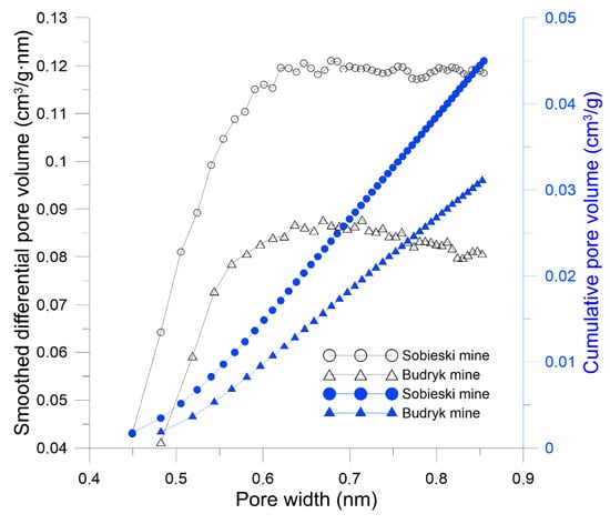 The differences in the values of structural parameters affect the sorption capacity and result, among others from different proportions of macerals in coals. Coals with a high content of vitrinite macerals, such as the ones from the Sobieski mine, have a more extensive structure in the range of micropores and ultramicropores and achieve higher values of structural and sorption parameters. In coals with a high content of intertinite macerals, as in Budryk mine, a large proportion of micropores and mesopores is noted. This affects lower values of pore volume and specific surface area. This is confirmed by studies based on CO2 adsorption. The pore size distribution of the tested coals was determined according to the HK model. It is presented in Figure 6. In Sobieski mine coal with a higher vitrinite content, a larger pore volume was obtained in the entire studied range of micropore diameters. The cumulative pore volume in Sobieski mine was 50% higher than Budryk mine (Figure 6).