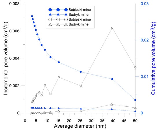 On the basis on the LPA results using N2, pore distribution was determined using the BJH model. Also in the range of mesopores (2–50 nm) Sobieski mine had a larger pore volume than Budryk mine in the entire diameter range. The largest volume was found in pores with diameters above 30 nm. It is presented in Figure 7.