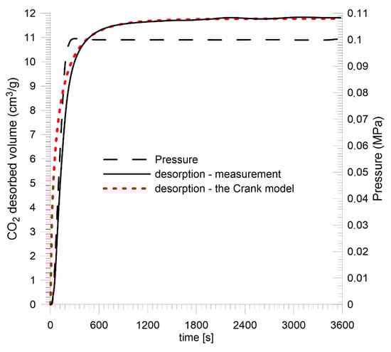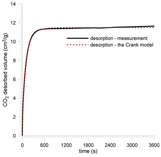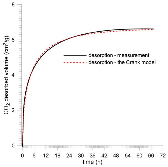 The Crank model obtained for spherical grains and plane sheet samples was extrapolated from the registered CO2 desorption kinetics. Literature review reveals that so far no sorption analysis results have been extrapolated with a Crank model other than for spherical grains.