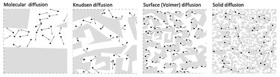 Desorption of gas sorbate from heterogeneous materials, including coal, comprises several processes. The gas molecule that leaves the coal structure is desorbed in the first stage. Desorption understood as an increase in the number of degrees of freedom of gas molecules is an almost instantaneous process [23]. Desorption initiates gas transport in a complex pore structure of coal. Traditionally, transport on a single-grain scale, treated as a monolithic area not cut by a crack network, is described as diffusion that is a combination of a number of mechanisms [24,25,26,27,28]. Molecular diffusion occurs when the average free path of gas molecules is significantly smaller than the pore size [29]. Knudsen diffusion occurs when the average free path of gas molecules is greater than the pore size. Collisions of gas molecules with pore walls play an important role. Volmer surface diffusion occurs when there is a concentration gradient of adsorbed gas molecules along the surface of a solid. Gas migration along the solid surface is possible thanks to the energetic heterogeneity of the surface. Diffusion in extremely narrow pores (solid diffusion) comparable to the size of gas molecules (diffusion in a solid body) applies when the pore diameter is close to the diameter of the gas molecules. A gas molecule permeating such small pores must have sufficient energy for it to be transported. It is called activated diffusion. The thermal vibrations of the sorbent network are conducive to this process.