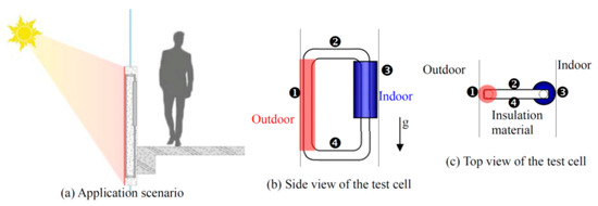 Figure 1a). The exterior wall of the structure that absorbs solar heat was simplified to a single vertical tube ❶ with a constant heat flux boundary. The structure was designed to be a rectangular thermosyphon to investigate its thermal performance in detail, as shown in