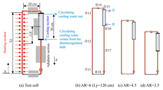 The loop in the experiment was made of red copper tube with a high thermal conductivity, and the entire loop had the same cross-sectional area. The round copper tube had an outer diameter of 12.7 mm and an inner diameter (Di) of 11 mm. The experimental test cell was installed inside the curtain wall. The lengths of the upper and lower adiabatic sections,
