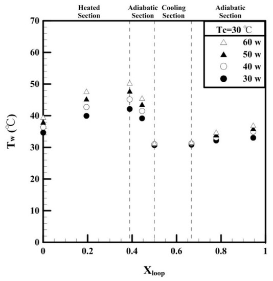 The variation of the wall temperature Tw of the thermosyphon shows that after entering the heating section, the wall temperature of the loop began to increase linearly and reached the highest temperature at the end of the flow passage. After entering the adiabatic section, the temperature decreased considerably. After entering the cooling section, the wall temperature quickly decreased to the set cold wall temperature. The results confirm that the cold wall temperature met the set isothermal state and that the temperature increased after exiting the cooling section.