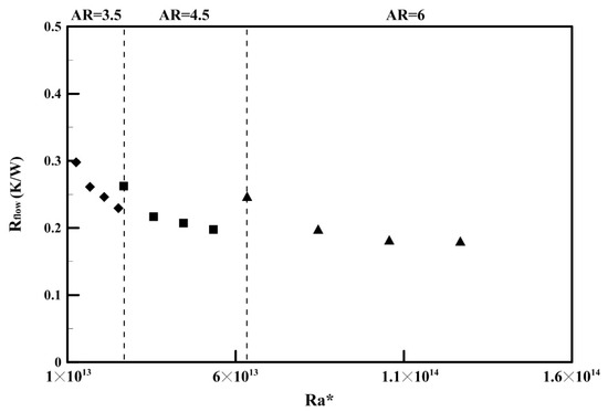 Ra* increased, Nu increased slightly. Nu increased with increasing AR, indicating that the AR affected the heat transfer performance of the rectangular thermosyphon, that is, with the same heating power, a higher AR corresponded to a better heat transfer capability.