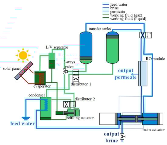 Figure 1) is used to transfer the working fluid from the low-pressure condenser to the high-pressure evaporator. The main actuator is composed of three chambers in order to make it behave in a symmetric way in both directions of movement, that is to say, in order to ensure that the pumped and the pushed-back volumes of water inside the chambers are equal. The pressurization is done in the middle chamber that contains the driving piston, which transmits the mechanical energy and sets the piston in movement in the two lateral chambers in order to realize the pumping of the saltwater and the filling of the transfer tank. Thanks to this main hydraulic cylinder, the feed water to be desalinated is firstly pumped, then goes through the condenser, thus acting as a cold source for the thermodynamic cycle, and is temporarily accumulated in one of the lateral chambers of the hydraulic cylinder. Simultaneously, as the piston moves, the water to be desalinated, which was previously accumulated in the second lateral chamber of the hydraulic cylinder, is pushed out and pressurized in order to fill the low-pressure water tank connected to the condenser. At the same time, the feed water that is pressurized in the other tank by the high-pressure vapor of the engine cycle flows through the RO membrane. Clean water (permeate) is produced and the brine, which is still at high pressure, is used to drive the above-mentioned hydraulic cylinder.