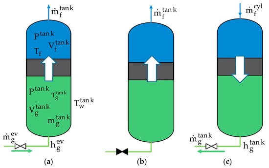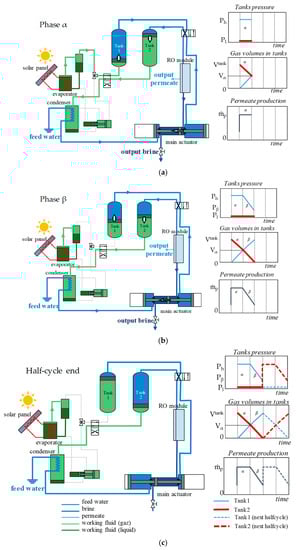 Figure 2b), the transfer tank 1 is disconnected from the evaporator. Thus, the tank is no longer fed with high-pressure vapor. Nevertheless, the pressurized vapor contained in this tank continues to push out the saltwater to the RO membrane, generating an expansion of the gas (increasing the gas volume) and thus a decrease of the pressure until a minimum allowable pressure, P