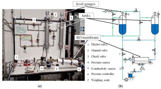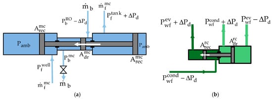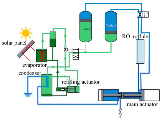 Figure 2a), the transfer tank 1 is linked to the evaporator, and the transfer tank 2 is connected with the condenser. The high-pressure feed water contained in the transfer tank 1 goes through the RO module and produces clean water under ideally constant pressure, P