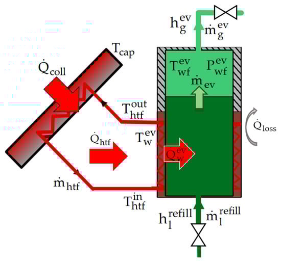 Figure 20, respectively, show the computed pressure and temperature evolutions of the evaporator over the day. The high pressure varies from 11 to 21 bars, which corresponds to a temperature range from 330 K to 360 K. It can be noticed that the evaporator pressure drop during the alpha phase rises with higher thermal power input. This is due to the increase of the vapor flow across the valve between the evaporator and the transfer tanks.