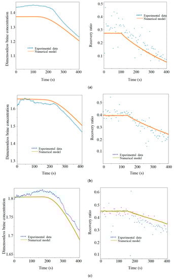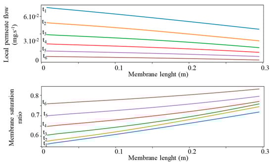 Figure 14 shows the local permeate flux and membrane saturation ratio evolutions for six time positions considered during the pressure-decreasing phase (corresponding to the beta phase of the desalination process). This case study enables assessment of the effects of a decreasing feed pressure on local membrane concentration and recovery rates.
