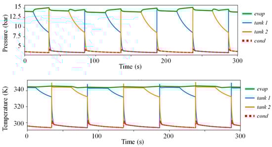 Figure 15 shows the pressure evolutions in the main components of the process. From this representation, the two main half-cycle phases clearly appear: the alpha phase, where the feed tank is maintained at high pressure, and the beta phase, where its pressure decreases since it is no longer linked to the evaporator. At the beginning of the alpha phase, the second tank is linked to the condenser, so its pressure suddenly drops to reach the condensation pressure. These results show the highly dynamic behavior of the process with half-cycles of about 50 s, shared between the alpha and beta phases. The refilling phase happens each three half-cycles, and can be identified from the pressure drop that occurs in the evaporator during its pressurization, that is, during the beta phase (here at 125 s).