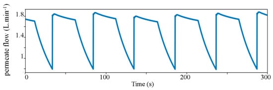Figure 16, the two working phases can also be identified. During the alpha phase, the permeate flow is quite stable even when a slight decrease can be noticed, meaning that the pressure applied to the membrane is unstable, as mentioned before. The decrease during the beta phase is, however, well-pronounced. Nevertheless, this flow decrease never drops to zero because the chosen end-pressure of the beta phase, here being 8 bars, is far beyond the feed-water osmotic pressure (3 bars).