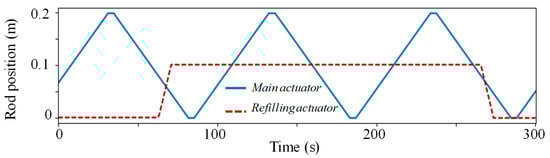 Figure 17 shows the operation of the two actuators and their rods’ positions during the running cycles. The design of these actuators, that is, the piston surface design, has led to consider a total stroke of 0.2 m for the main actuator and 0.1 m for the refilling actuator. The main actuator rod is always in movement, oscillating between its initial position and its end stroke with a constant speed, as the mass flow rate of the brine is controlled and maintained to a constant value. This oscillating movement demonstrates the correct actuator sizing. The other actuator, the refilling one, is activated at every refilling phase, which takes place during a beta phase. It goes until its total stroke is reached, and remains in its position until the next refilling phase, activated by a low liquid level of working fluid in the evaporator.