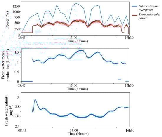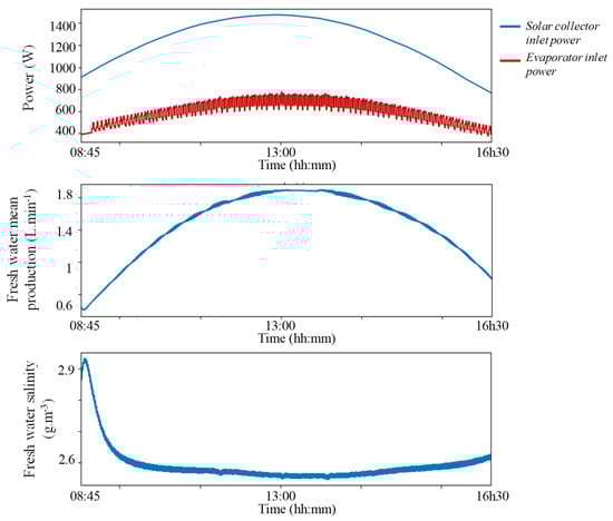 Figure 21, the first plot shows solar power that is transmitted to the solar collector and the inlet evaporator power. During the cloudy periods, the evaporator and collector temperatures reach a thermal equilibrium, and then the evaporator inlet power drops to zero. The second plot shows the permeate production averaged over each half-cycle. The permeate flow follows the evaporator power over the day and is rarely null, thanks to the process inertia. The last plot shows the permeate salt concentration that oscillates between 2.5 and 3 mg·L