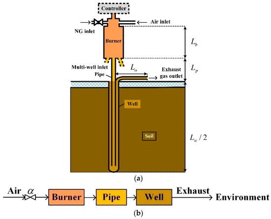 Figure 1 presents a general description of a traditional in situ thermal remediation system, that is a polluted-soil thermal remediation system including burner, pipe, well and soil. As Figure 1a shows, natural gas (NG) and air enter the burner through different inlets and an air-NG mixture is delivered to the burner, in which chemical energy of natural gas (NG) is converted to thermal energy in the exhaust gas by burning. The high temperature exhaust gas produced by the burner flows through the pipe into the heating well inserted vertically in the soil. The well is the heat transfer component of the whole system, in which the high temperature exhaust gas flows transferring heat to the soil to raise the soil temperature through the walls of the well. The volatile pollutants contained in the soil will then evaporate. As shown in Figure 1b, the gas flows directly in the system and is eventually discharged into the environment without recovery or recycling. In such a flow, the energy in the flowing gas is used only once to heat the soil. From the point of view of energy utilization, this is undoubtedly a huge waste.