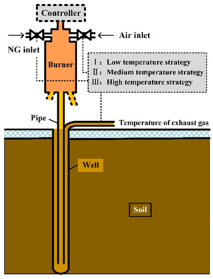 In the burner, incomplete combustion caused by inadequate mixes of fuel and air or the low temperature in the combustor cause energy losses. There are also heat leakage, air leakage and flow loss in the burner. After the energy loss is removed, the remaining energy flows out of the burner and through the pipe into the heating well. There are heat leakage and flow loss in the pipe. Local flow loss exists in the heating well because of the bent pipe. Part of the energy flowing to the heating well is transferred to the soil, heating it. The remaining energy is discharged directly to the environment by the outlet of the heating well through high-temperature exhaust gas, resulting in the maximal energy loss of the whole system. In addition to heating up the soil, the energy in the soil will also lose heat to the surrounding non-heating soil zone and to the air through the surface insulation layer.